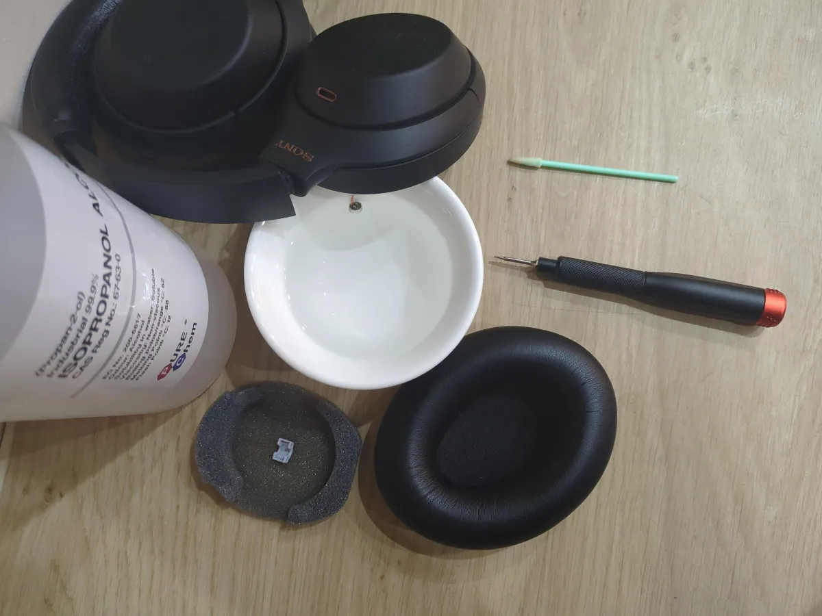 Fix high-pitched whine and feedback in Sony WH-1000XM4 headphones caused by contaminated ANC microphones. Step-by-step repair guide using isopropyl alcohol cleaning method.